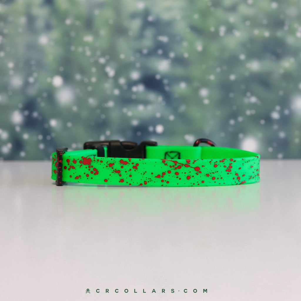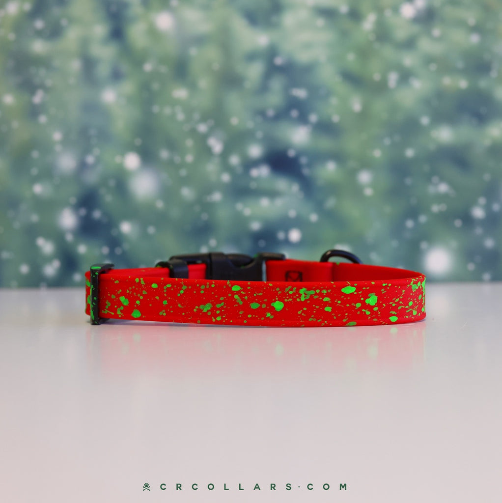 The Christmas Kyon Flex set is perfectly festive to outfit your pets for the holiday season. Offered in two color ways so you can mix and match collars and leashes. Red is hand painted with a neon green splatter, and neon green is hand painted with red splatter. Easily adjustable, lightweight, and quick-release this collar does it all. Offered in 4 sizes to fit most every dog (and cat) with badass black super durable plastic hardware, this will be your dogs new favorite collar. *Please note splatter is hand painted and unique to each collar, so placement will vary. Leash measures 4-foot long, 3/4" and is the most comfortable, light-weight leash you will ever use.
