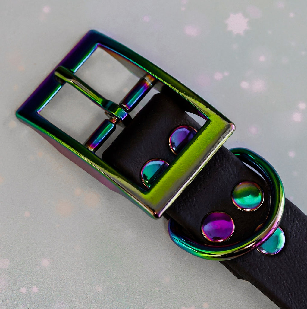 The Magic Kyon Venetian Collar measures 1" wide with no taper at the buckle. Crafted from our black Kyon with hand set crystals in ocean opal shimmer with a rainbow buckle and d-ring and black hardware.