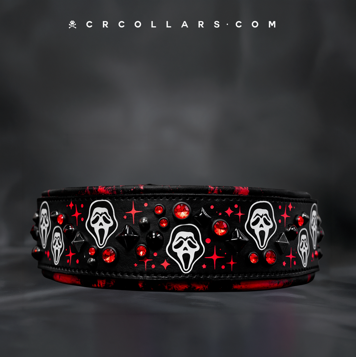 This collar SCREAMS horror fan. Honoring the Scream franchise in anticipation of Scream 7 debuting today. Crafted from premium black bridle leather, with blood red crystals, complete with killer black and red custom padding and black hardware. This collar measures 2" wide (+padding about 2-1/2" total width) and tapers to an 1-1/2" buckle. If you prefer a 1" tape just request it when you order.