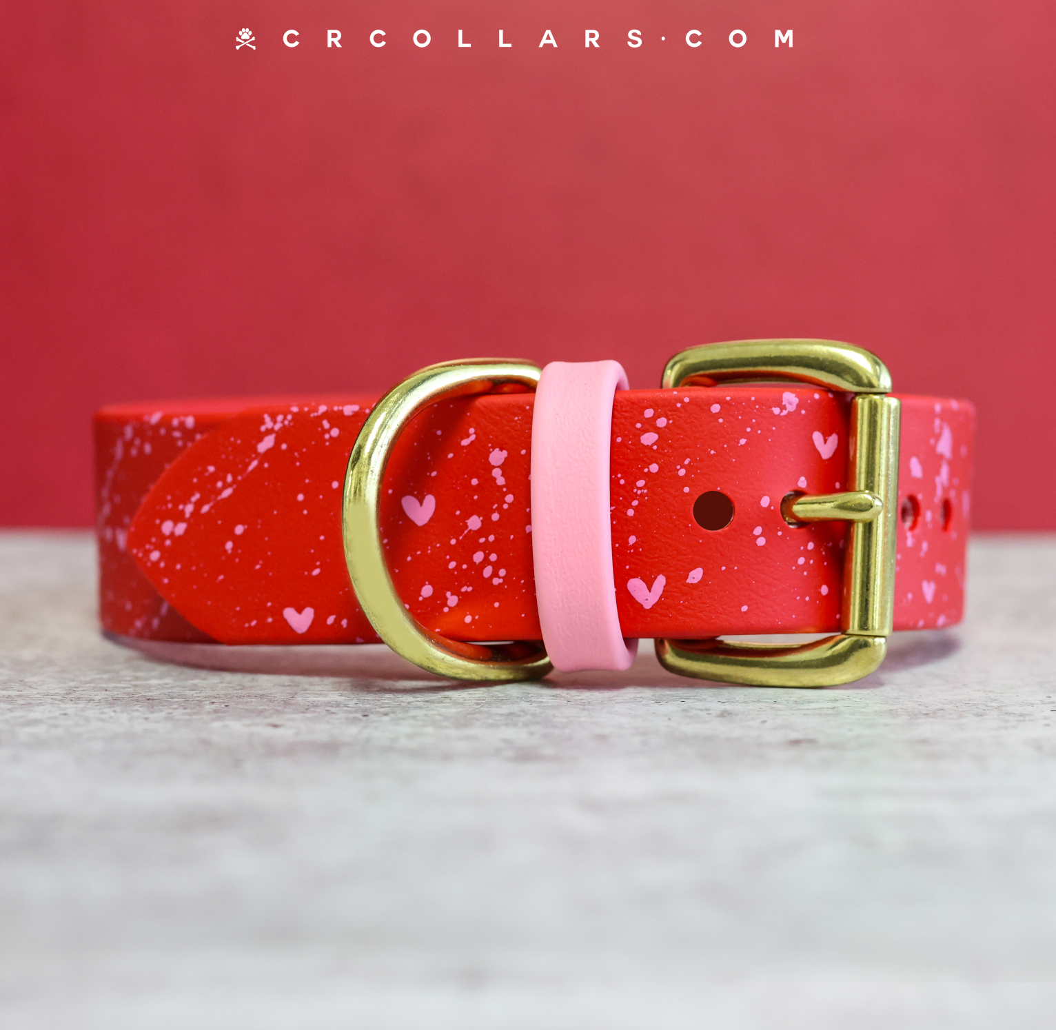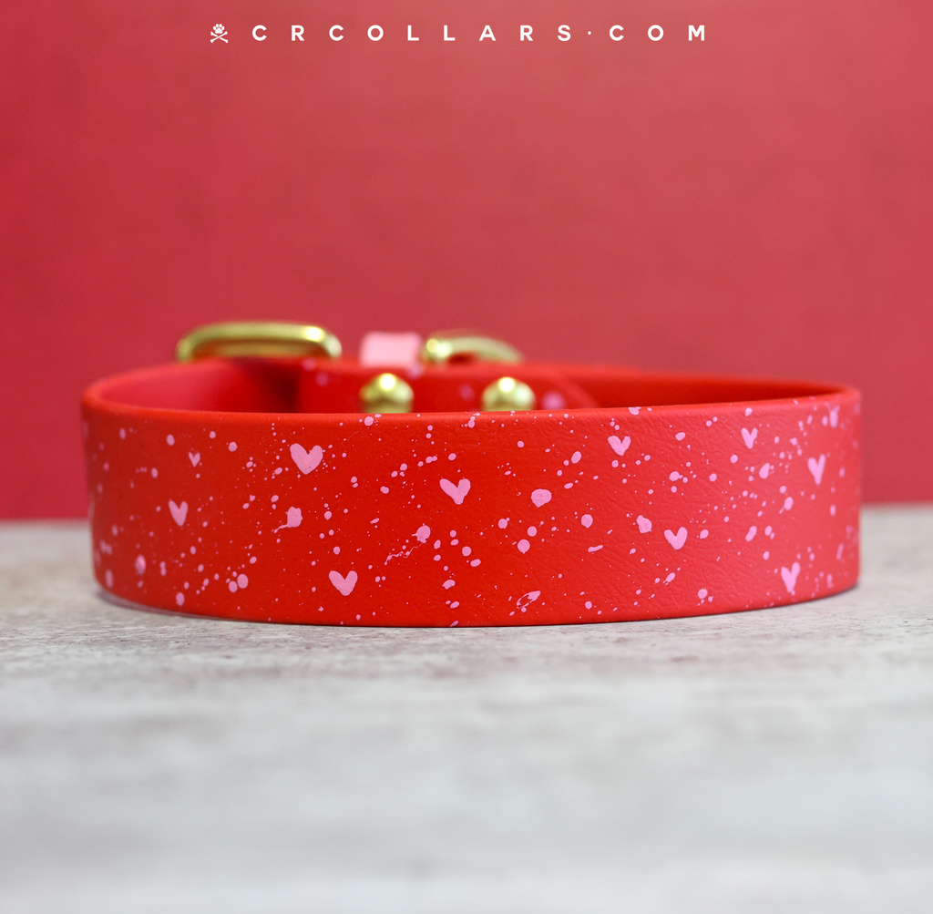 Featuring red Kyon base dotted with hearts and a light pink splatter and your choice of hardware. 1-1/2" sizes come with a contrast light pink strap keeper. 3/4" and 1" widths do not have a strap keeper.