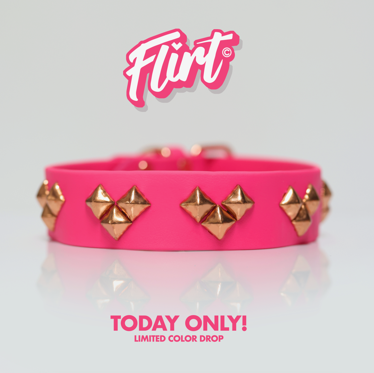 This Flirt collar has heart. Choose your size, width, and collar color. Offered in 3/4" or 1-1/2" with rose gold hardware.